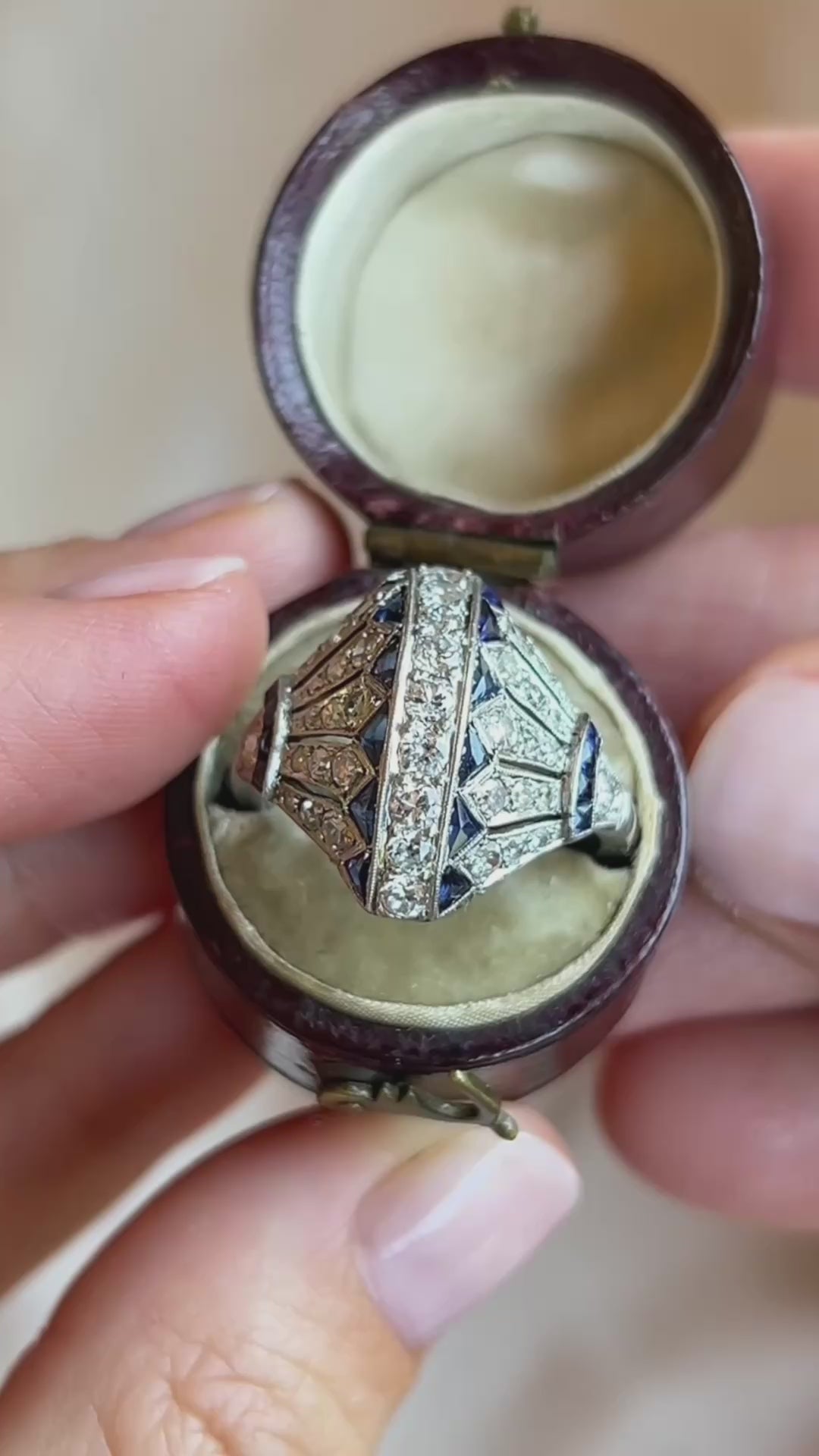 Antique Art Deco Egyptian Revival dinner ring, a remarkable piece from the 1920s that beautifully combines Art Deco design with the intricate detail of Egyptian Revival motifs. This ring is a testament to the craftsmanship of its era, featuring tapering lines of old single cut diamonds that create a captivating contrast with bright blue angular calibré cut sapphires. The design is exemplar of the highly stylized and geometric patterns characteristic of Egyptian Revival jewelry, making it both unique and visually striking. Crafted in a comfortable platinum setting with delicate millegrain detailing, this ring not only showcases its design elements but also ensures the ease of wearability. What sets this ring apart is its ability to capture the essence of its time. It's a finely made piece of jewelry that embraces the design aesthetics of the Art Deco era and presents them in a tightly formed and absolutely stunning package.